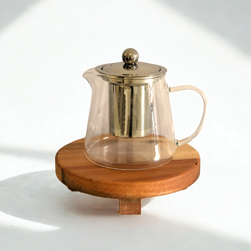 Tetera de vidrio de borosilicato con infusor y tapa de acero inoxidable.